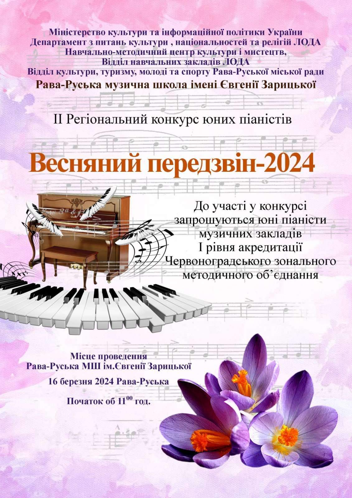 ІІ Регіональний конкурс юних піаністів "Весняний передзвін - 2024"Рава-Руська МШ ім. Євгенії Зарицької Навчально-методичний центр культури і мистецтв ЛьвівщиниВідділ культури, [...]