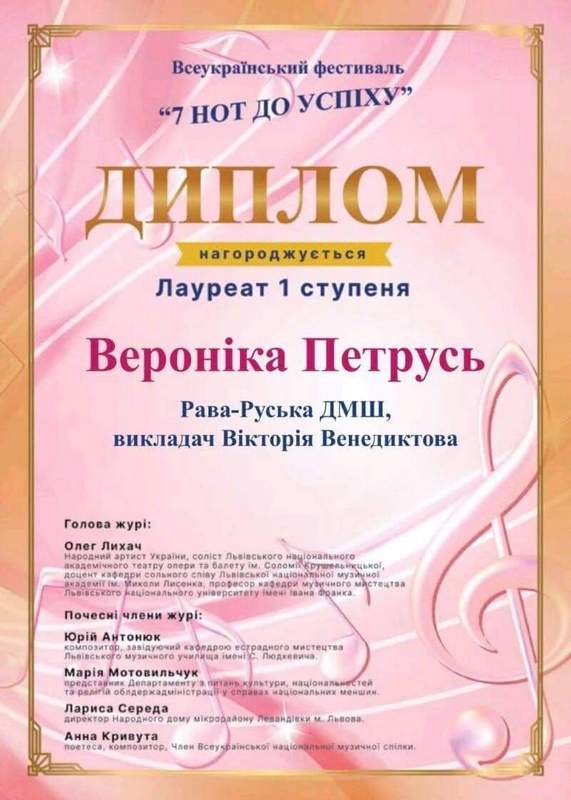 Вітаємо лауреатів всеукраїнського конкурсу "7 нот" до успіху", м. Львів: Лілія Лаврів - ГРАН-прі Вероніка Петрусь - лауреат 1 премії Старший викладач - Вікторія Венедиктова [...]