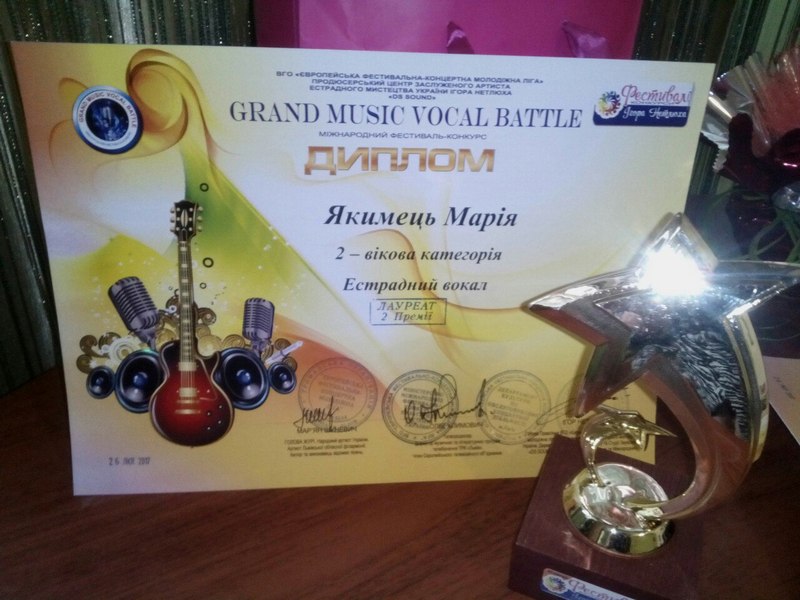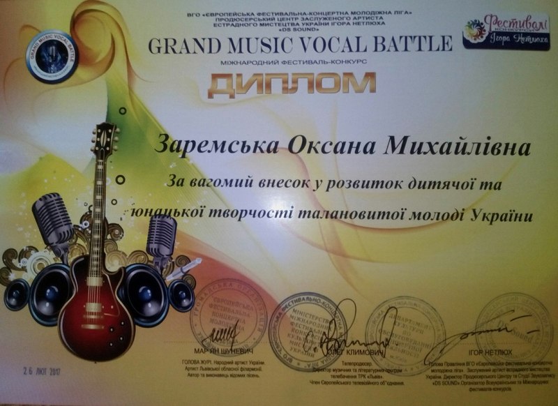 24 - 26 лютого 2017 року в місті Львів, Палац Культури ім. Гната Хоткевича, відбувся Міжнародний вокальний фестиваль-конкурс "Grand music voсal battle". Участь брали солісти, дуети, ансамблі та хорові колективи. Гарний результат у цих вокальних батлах, адже учасників було понад 200, показали учні виклача Заремської О. М., які представляли нашу школу: