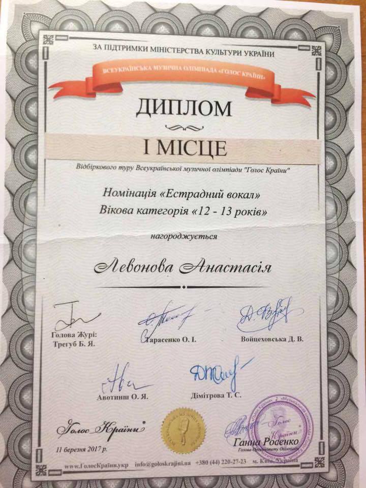 Левонова Анастасія -1 премія (поп категорія 12-13 р ) та подарунковий сертифікат на безкоштовну участь в весняній олімпіаді ,