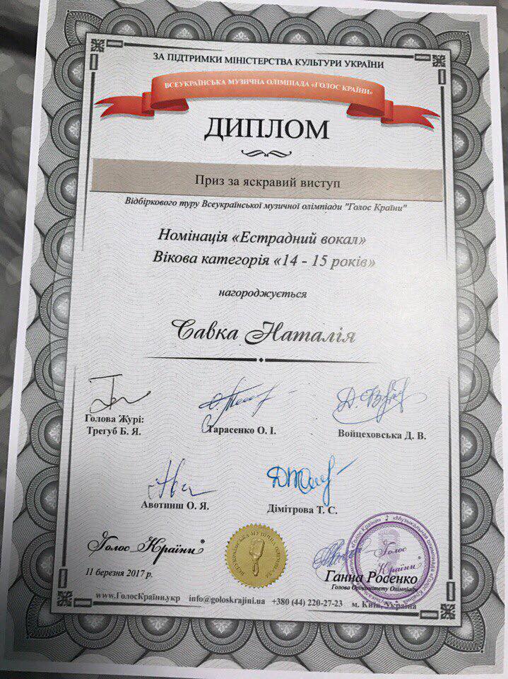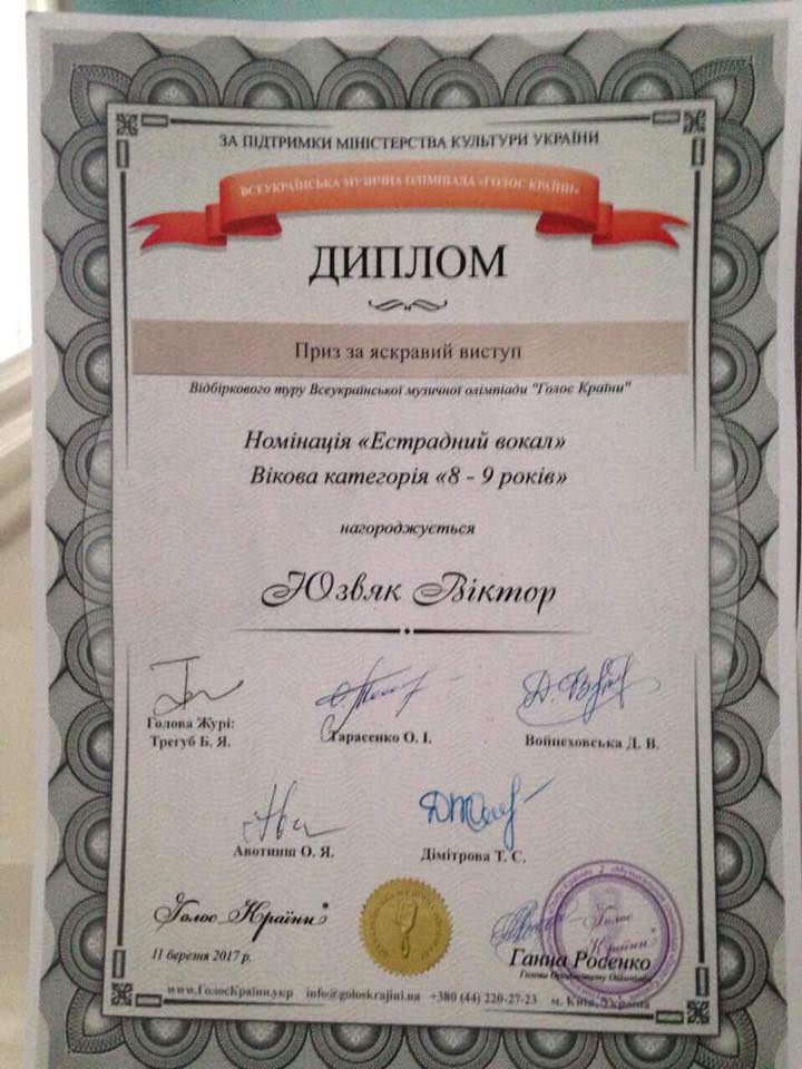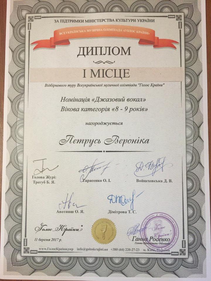 11 березня 2017 на сцені «In-Jazz Live!» музичного магазину "In-Jazz" пройшов відбірковий тур Всеукраїнської музичної олімпіади "Голос Країни". До складу журі відбіркового туру увійшли викладачі вузів Києва, музиканти та діячі мистецтв - Валерій Матюхін, Олег Безбородько та Вероніка Левко. Учні вокального класу викладача Венедиктової Вікторії Юріївної, приїхали з високими нагородами, а саме:
