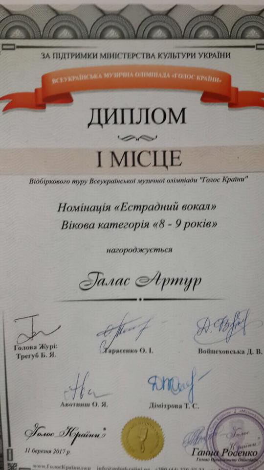 Артур Галас - 1 премія (категорія 8-9 поп вокал),