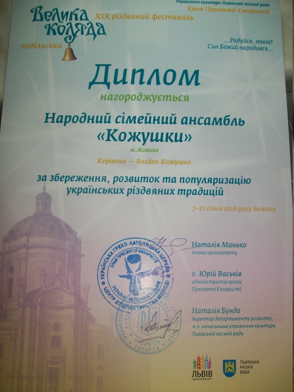 19 січня 2018 року народний сімейний ансамбль “Кожушки” (керівник — Богдан Кожушко) колядував у Львові на XІX різдвяному фестивалі “Велика коляда”, що традиційно відбувається в храмі Пресвятої Євхаристії. Цьогорічний фестиваль присвячений українському композитору Миколі Леонтовичу, тому тематика — подільська коляда.