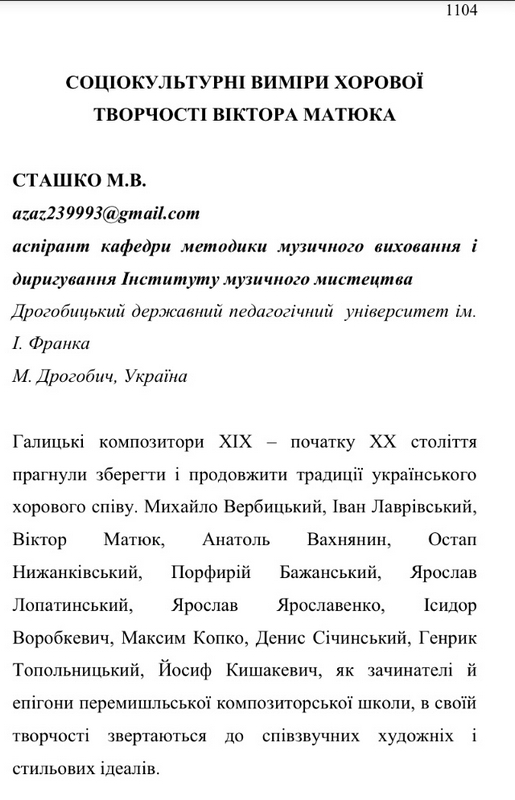 Молодий викладач Рава-Руської ДМШ Сташко Марія Володимирівна отримала дозвіл на публікацію тез за напрямком 16. Мистецтвознавство на тему: «Соціокультурні виміри хорової творчості Віктора Матюка».