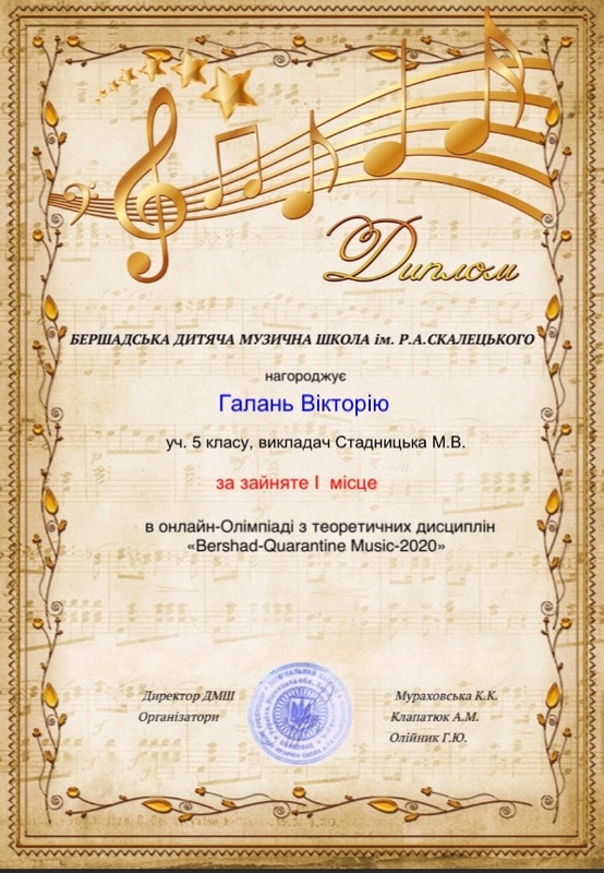 Викладач Стадницька М.В. – Галань Вікторія,5кл. – І місце,