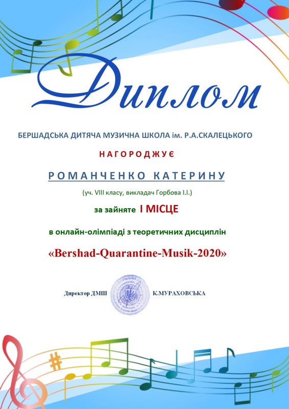 Викладач Горбова І.І. – Романченко Катерина, 6кл. – І місце;