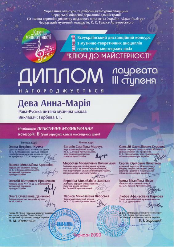 Дева Анна-Марія, уч. 4 кл. викладач Горбова І.І. – Диплом ІІІ ступеня