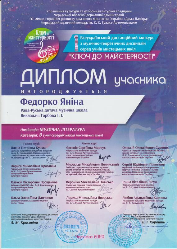 Федорко Яніна, уч.4 кл. викладач Горбова І.І. – Диплом учасника