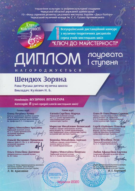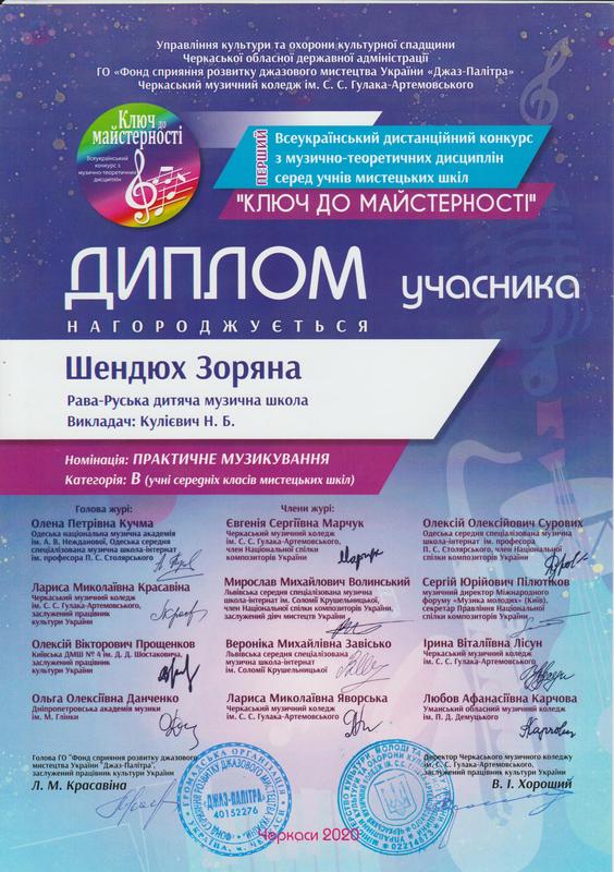 Шендюх Зоряна, уч.5 кл. викладач Кулієвич Н.Б. – Диплом учасника
