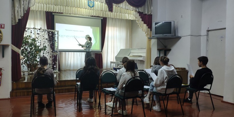 На протязі всього уроку учні були зосередженими та уважними, із задоволенням виконували поставлені завдання. Особливої старанності вимагала спільна робота з викладачем над чистотою інтонування одно-, дво-, триголосся та написання музичного диктанту.