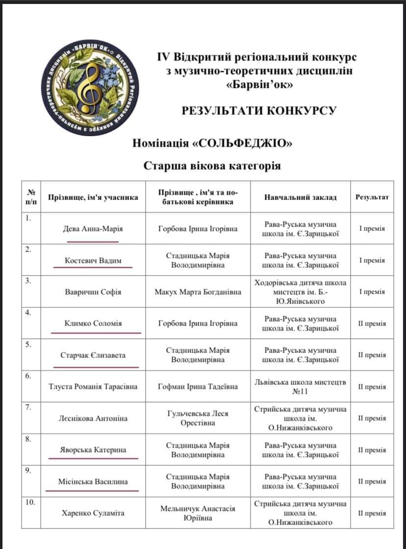 Щира подяка організаторам конкурсу Дрогобицький музичний фаховий коледж ім. Василя Барвінського, Теоретики ДМК ім. В.Барвінського, Оксана Рудавська,а також вдячність батькам, за підтримку та розумних дітей!