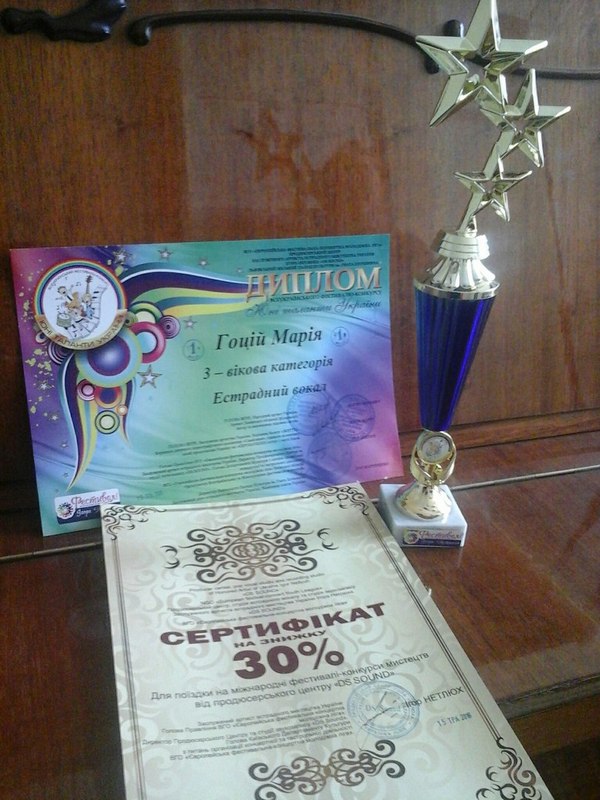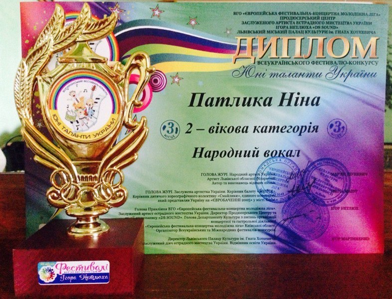 13 травня 2016 року у місті Львів палаці культури ім. Гната Хоткевича відбувся Всеукраїнський фестиваль-конкурс "Юні таланти України" і діти нашої школи повернулися з гарними результатами. Гоцій Марічка (3 вікова категорія) естрадний вокал - 1 премія , Патлика Ніна (2 вікова категорія) народний вокал - 3 премія, Левонова Анастасія (2 вікова категорія) естрадний вокал - 1 премія (викладач Венедиктова В.Ю.) Гоцій Марічка і Левонова Анастасія також отримали скрифікати з 30% знижкою для поїздки на міжнародні фестивалі-конкурси мистецтв від продюсерського центру Ігора Нетлюха. Ми пишаємось вами.